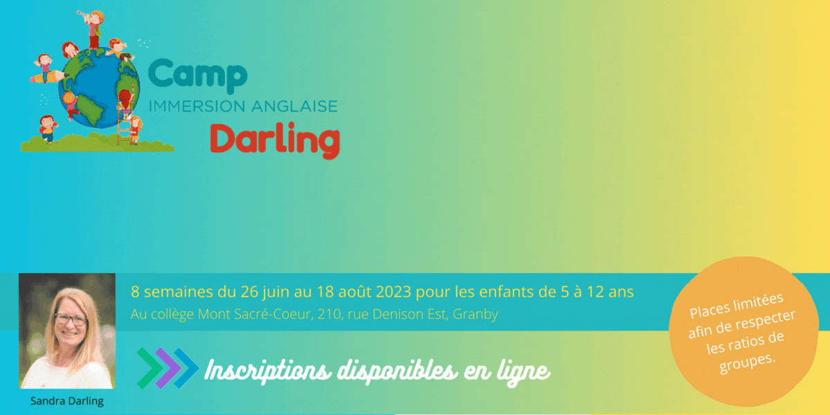 Depuis 2005, Sandra Darling et son équipe offrent aux enfants un endroit sécuritaire, une ambiance familiale et un encadrement éducationnel afin de favoriser l’apprentissage de l’anglais. Vos enfants sont uniques et ils seront traités ainsi tout au long de leur séjour au camp. L’entraide est encouragée entre les enfants, le respect et la participation active aussi. Vos enfants repartiront avec un sentiment d’accomplissement, de confiance en soi et de fierté d’avoir persévéré.