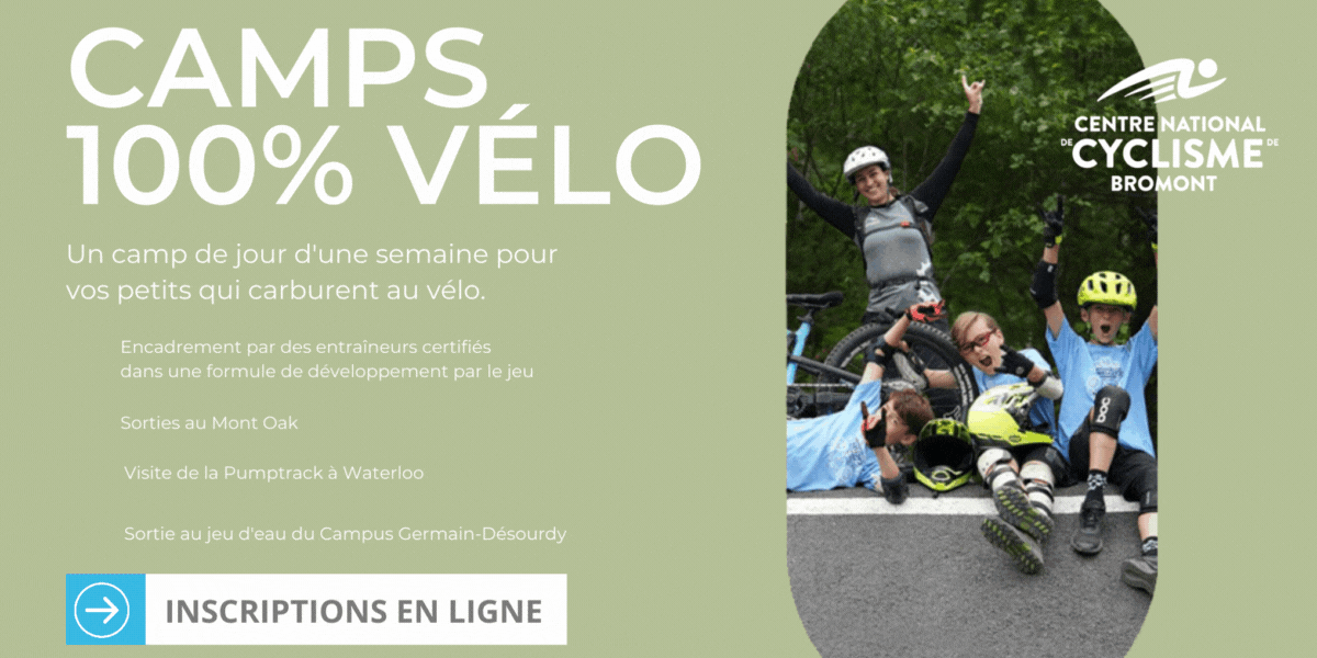 Votre enfant raffole du vélo? Offrez-lui l’opportunité de s’amuser tout en améliorant ses habiletés à vélo en participant aux camps de jour du Centre National de Cyclisme de Bromont (CNCB) ! Situé à quelques coups de pédales du cœur de Bromont, sur un terrain de jeu exceptionnel, le CNCB dispose d’infrastructures cyclistes uniques permettant une foule d’activités à vélo dans un environnement sécuritaire et hautement divertissant !