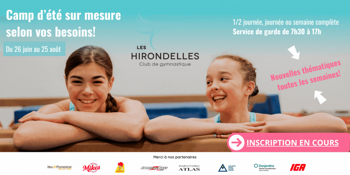 Véritable référence de la gymnastique dans la région, pas étonnant que le camp de jour des Hirondelles soit aussi couru! De plus, depuis son déménagement au Mont Sacré-Cœur, le club profite d’un super beau, et grand, terrain extérieur et on nous assure qu’il sera exploité au maximum. Garçons et filles de 5 ans et plus pourront donc s’en donner à cœur joie du 26 juin au 25 août.