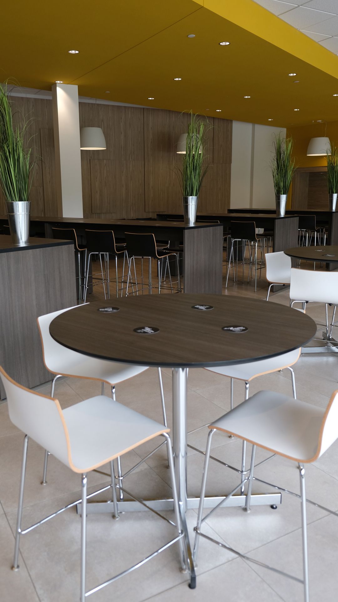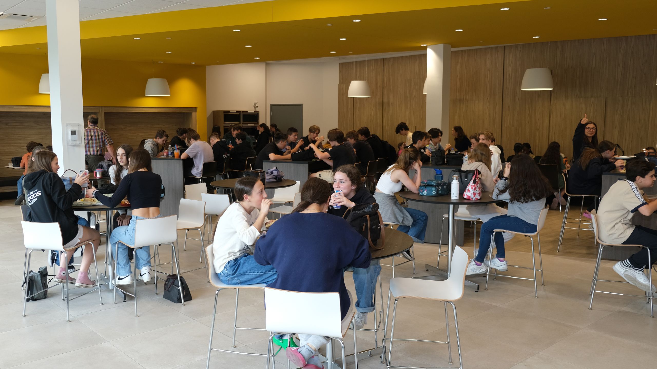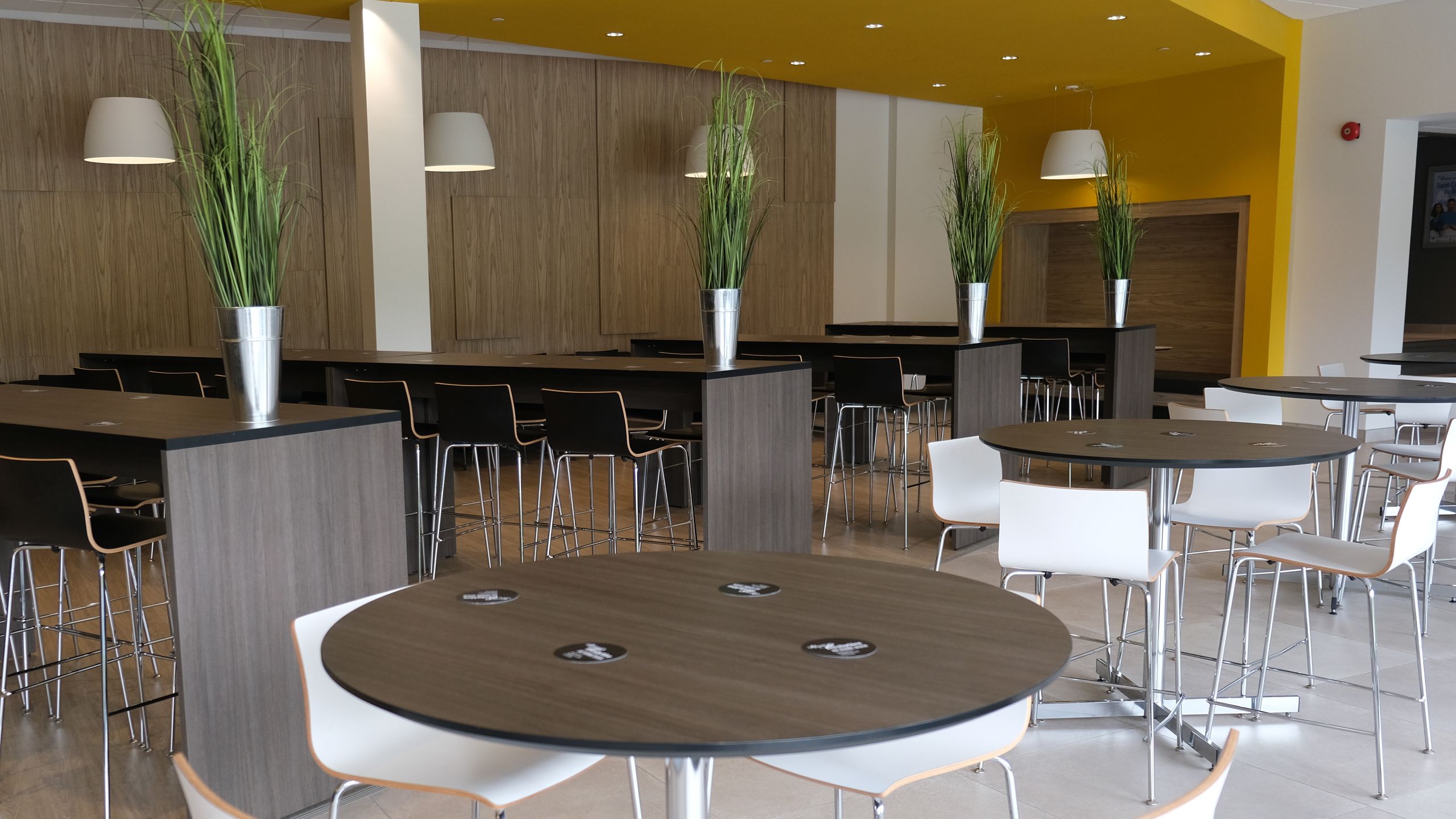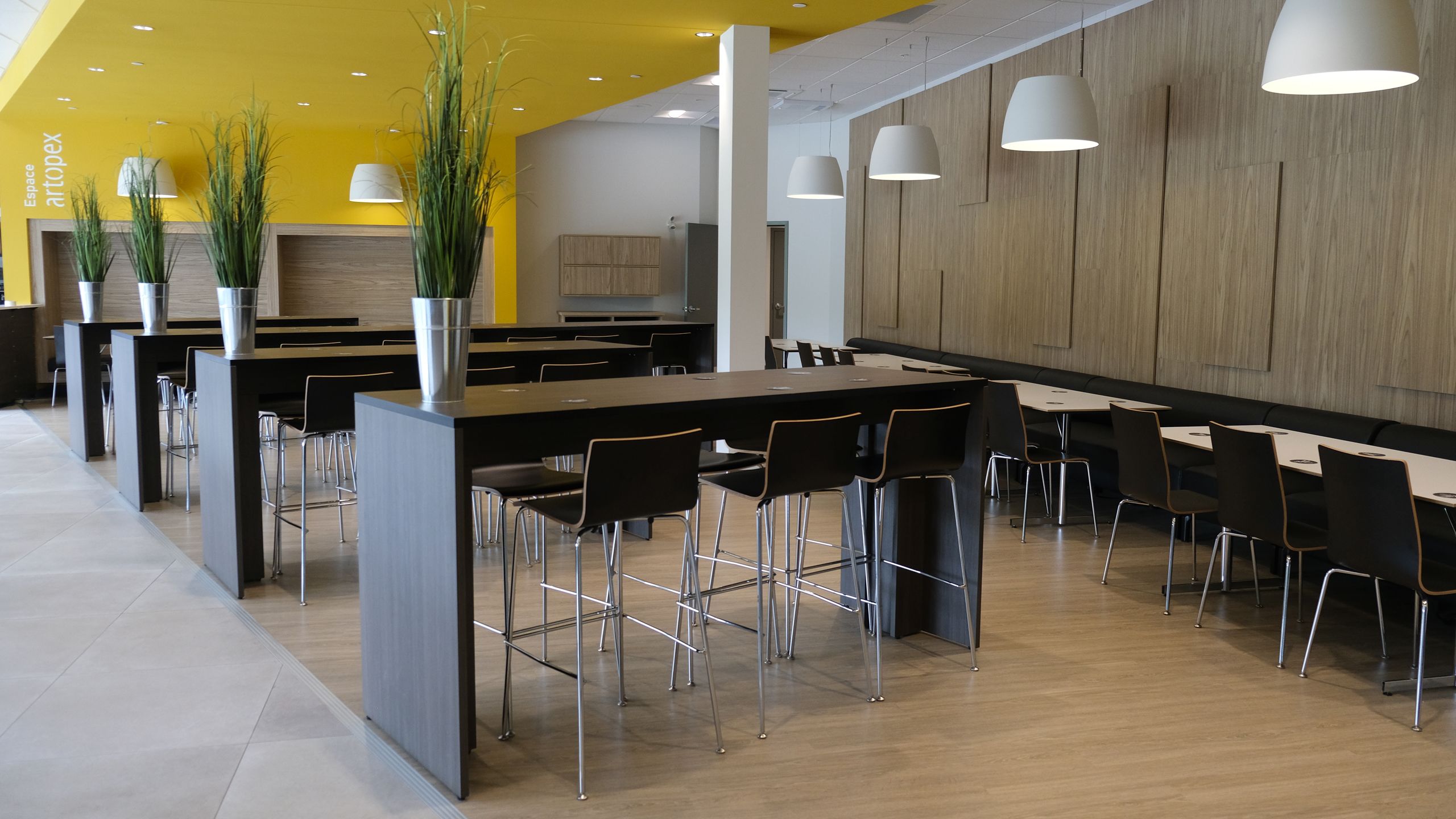 Sitôt passé la porte, un sentiment de bien-être nous interpelle. L’ameublement, signé Artopex et soigneusement choisi, nous invite à nous y asseoir afin de contempler la grandeur de l’espace et du lieu. Tables bistro, banquettes, fauteuils, retombée de plafond, éclairage – tout est propice à la discussion et à la socialisation. La salle à manger pour les étudiants se transforme, le soir venu, en foyer pour le Théâtre L’Aparté.